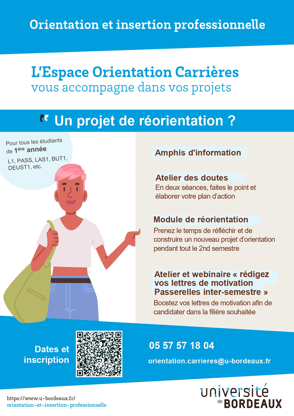 Un doute sur votre orientation ? Envie d’explorer une nouvelle voie ? L’Espace orientation carrières est là pour vous guider et construire avec vous un plan d’action adapté à vos objectifs. Suivez le lien : www.u-bordeaux.fr/formation/accompagnement-et-reussite-des-etudes/orientation-et-insertion-professionnelle/reorientation