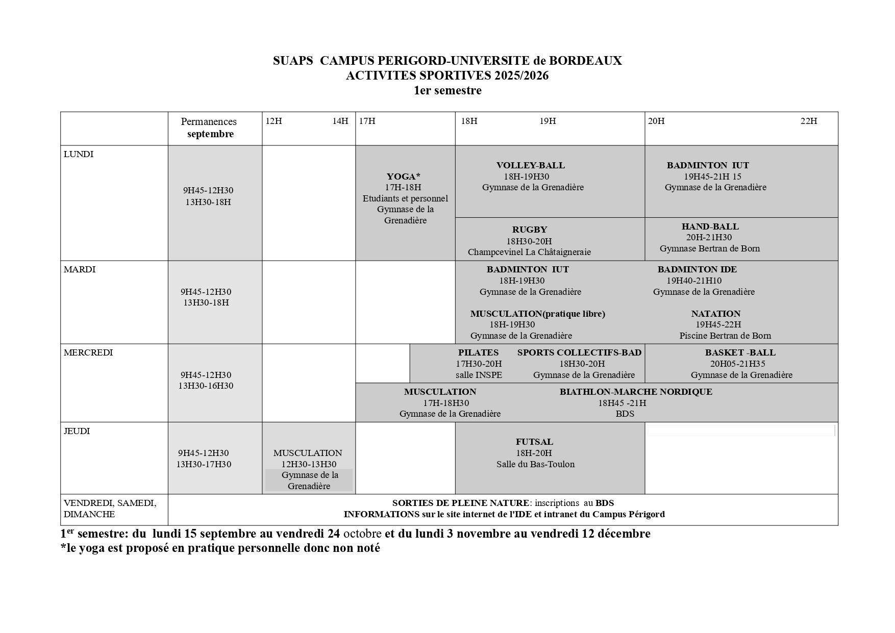 Le SIUAPS (Service Inter Universitaire des Activités Physiques et Sportives de Bordeaux) propose de nombreuses activités sportives et sorties durant toute l'année universitaire :