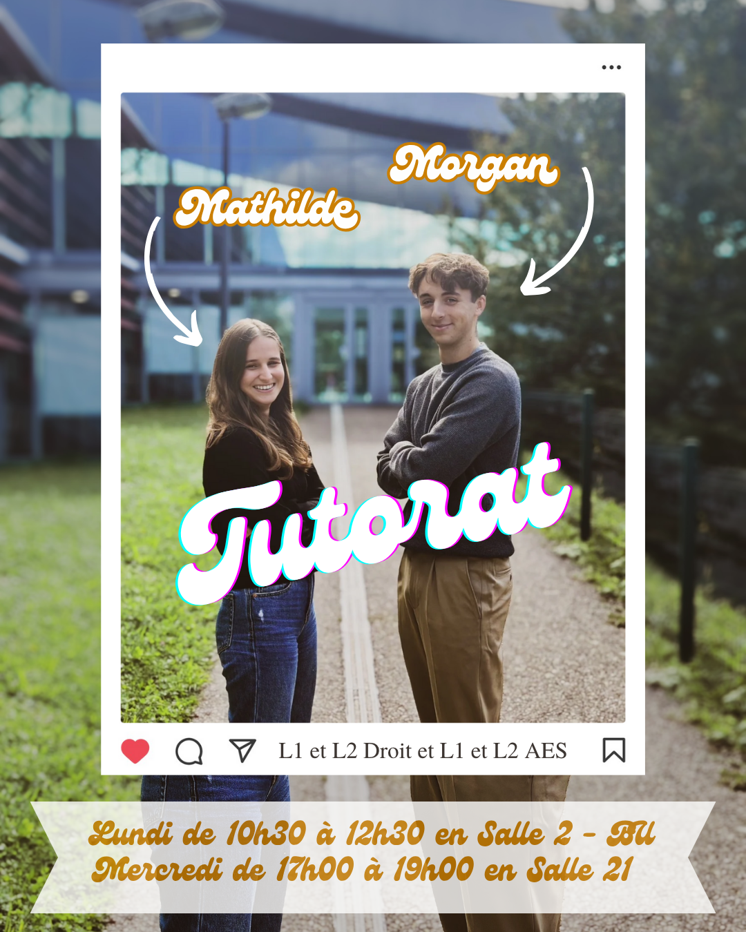 Chaque lundi de 10h30 à 12h30 en salle 2 de la BU et chaque mercredi de 17h00 à 19h00 en salle 21, Mathilde et Morgan accueillent les étudiants pour des séances de tutorat. Ils pourront répondre à toutes questions de méthodologie ou pédagogiques concernant les cours et les TD.